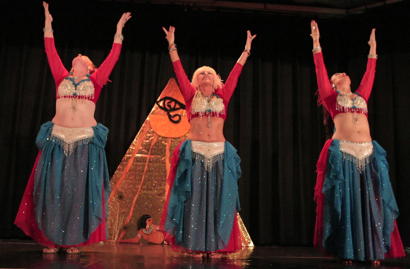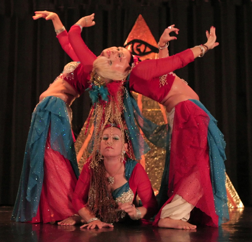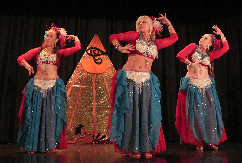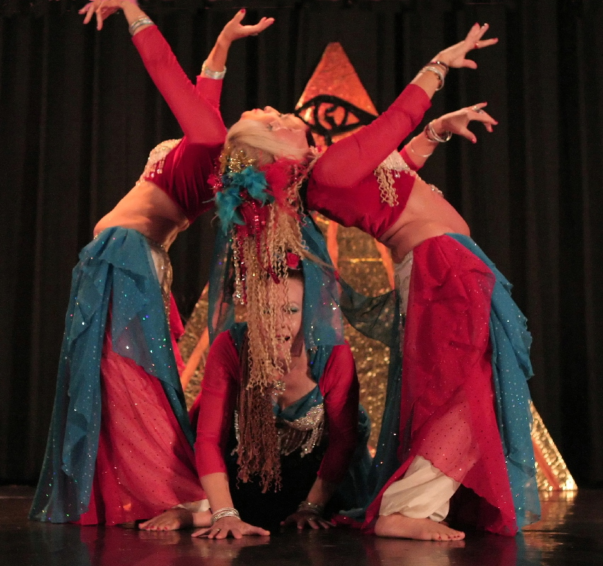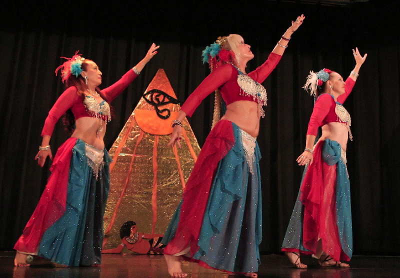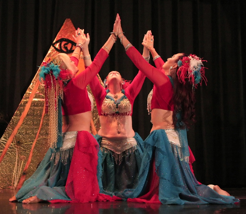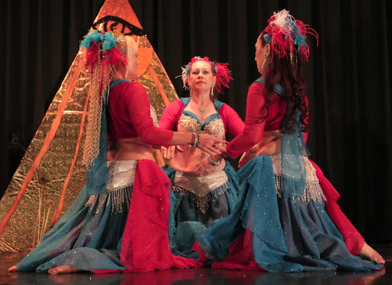 Bahira, Fara'Asha & Shiva of Indigenous performed a fusion and traditional mix of belly dance at the annual Desert Dance Festival put on by Dunia & Scarab Productions. This year the 2-day Festival was held at the Rosicrucian Egyptian Museum & Planetarium, 1342 Naglee Avenue, San Jose, California. Vendors offer their wares on the stunning grounds and gardens of the Museum and workshops by highly respected teachers were held at the Hoover Auditorium across the street. On Sunday, Indigenous had a great time performing on the Francis Bacon Theatre stage in eye-catching new crystal, turquoise and red costumes.
