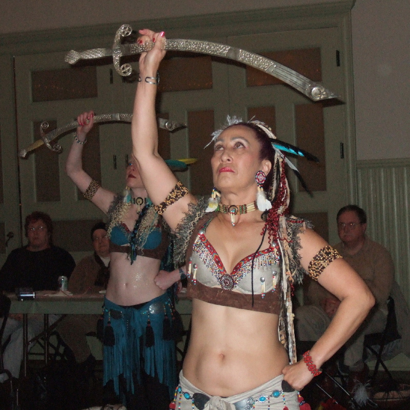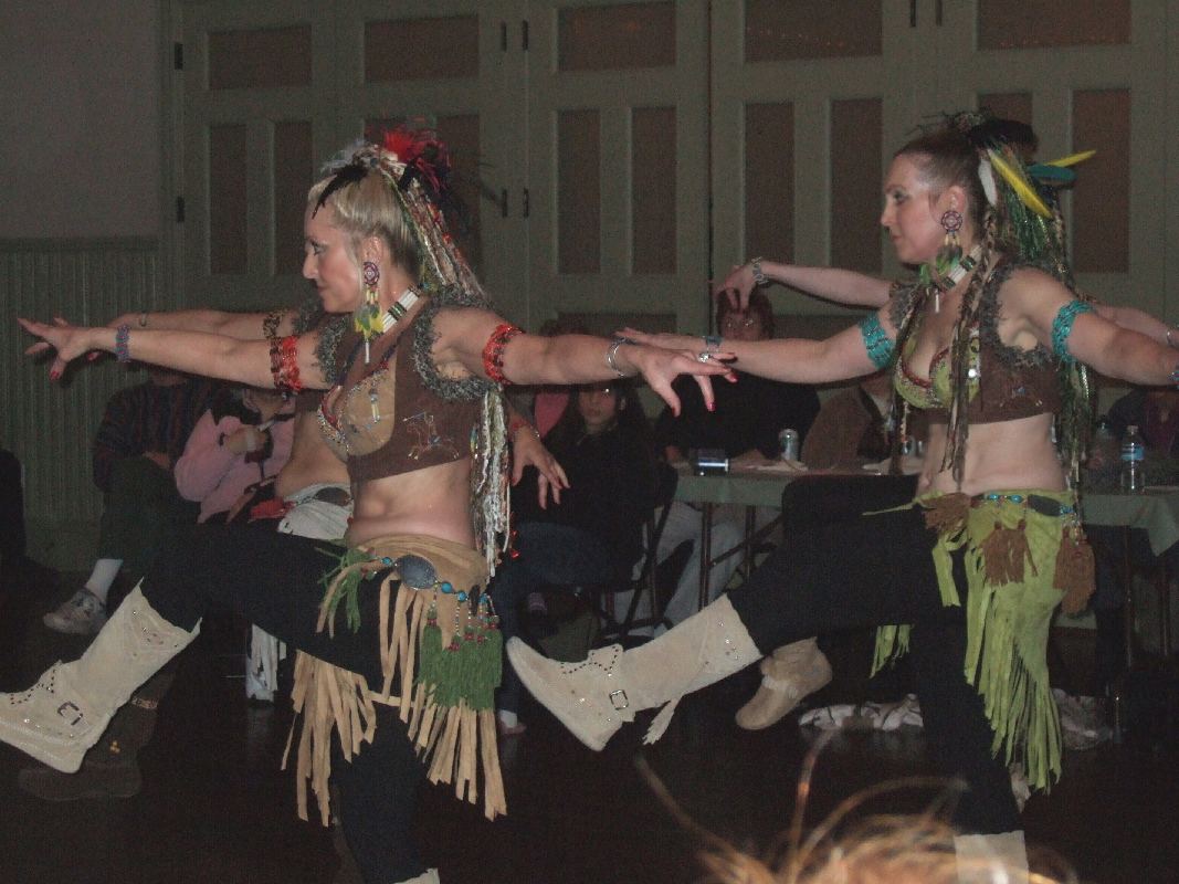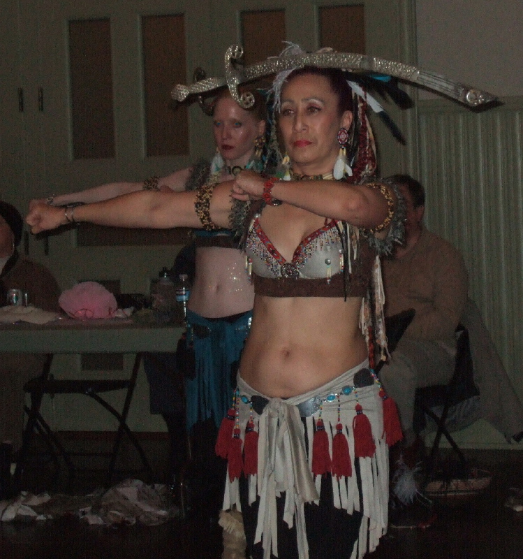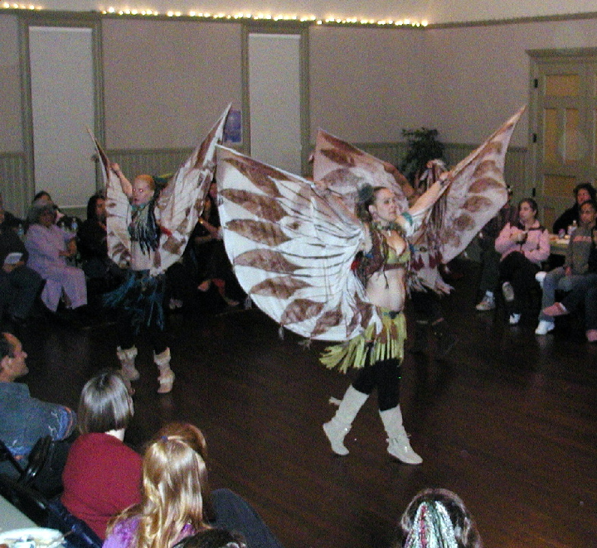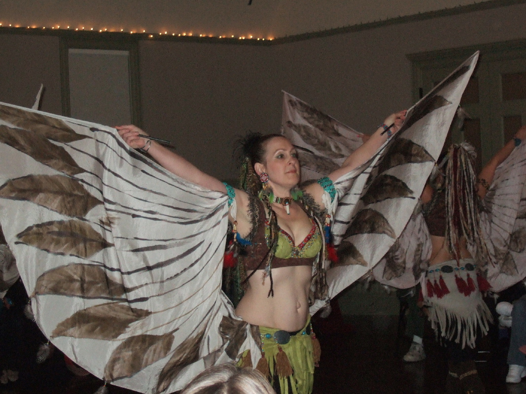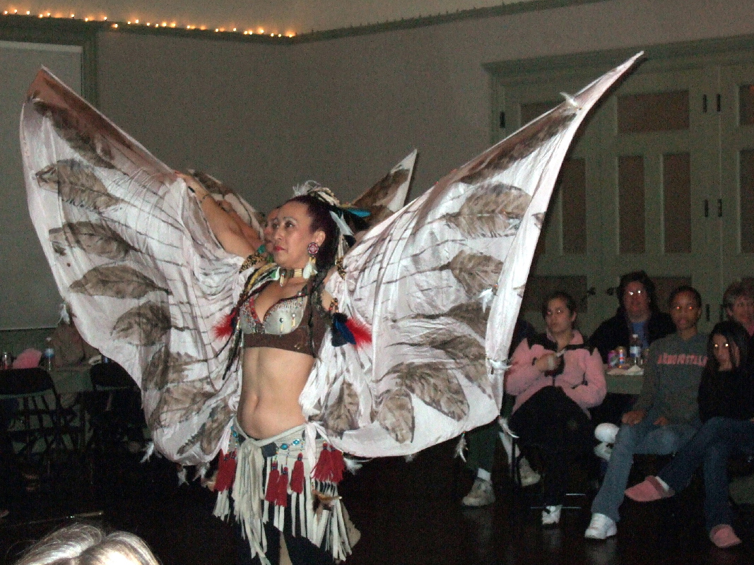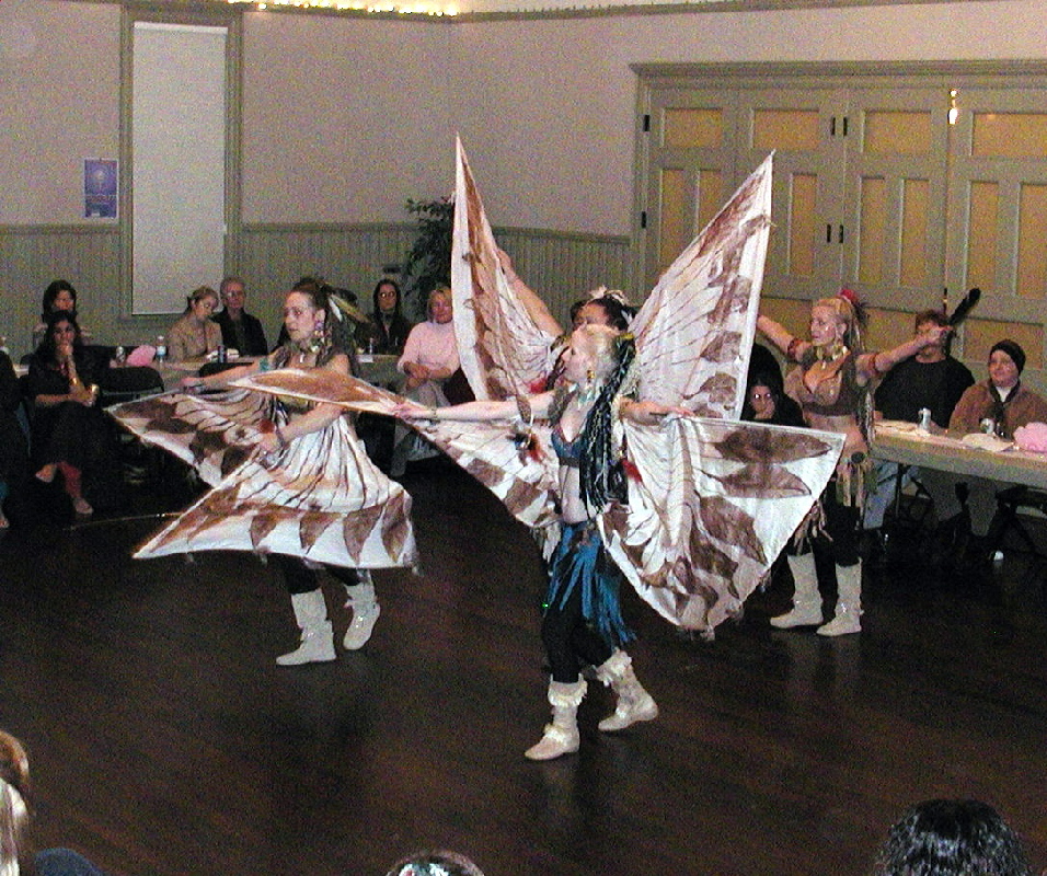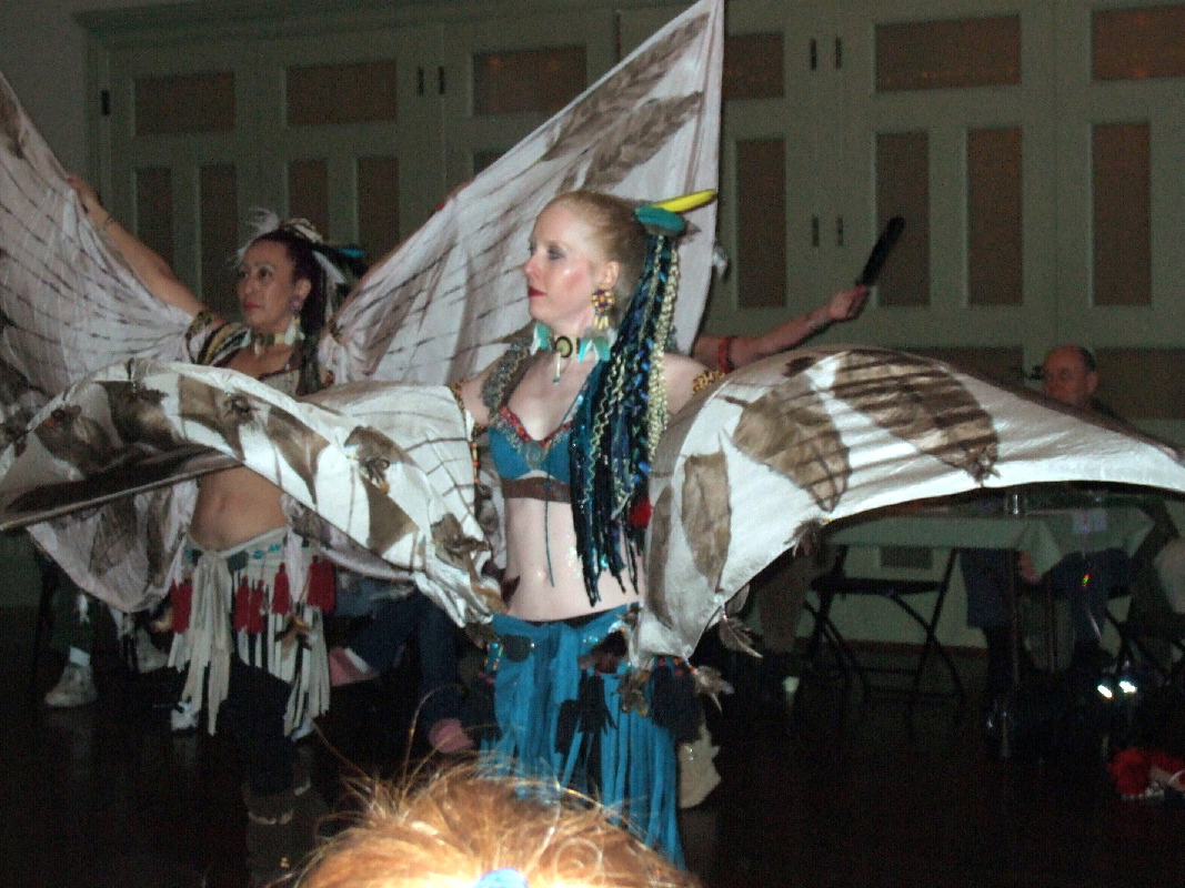 Indigenous debuted their new AmerIndian Fusion set of dances entitled "Birds of the Air and Earth" which opened with "Eagle Calling" a fast paced trio of silk wings hand painted by Zora, choreography by Bahira.